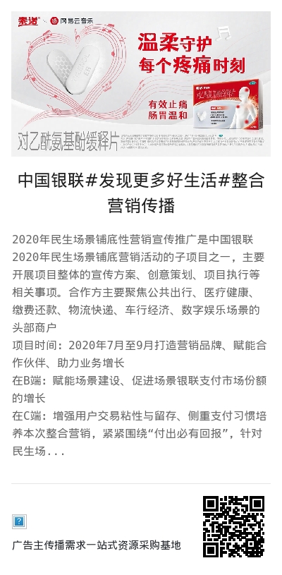 2020年民生场景铺底性营销宣传推广是中国银联2020年民生场景铺底营销活动的子项目之一,主要开展项目整体的宣传方案、创意策划、项目执行等相关事项。合作方主要聚焦公共出行、医疗健康、缴费还款、物流快递、车行经济、数字娱乐场景的头部商户
