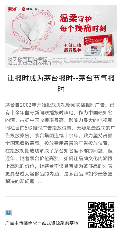 茅台自2002年开始投放央视新闻联播报时广告,已有十余年坚守新闻联播报时阵地。作为中国最知名的酒,占据中国收视率最高、影响力最大的电视新闻栏目前5秒报时广告投放位置,无疑是最成功的广告投放案例。