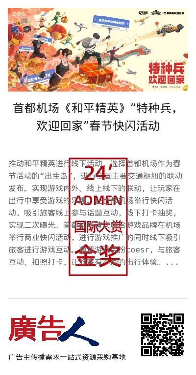 携手腾讯旗下热门游戏《和平精英》在首都机场T3举办了一场别开生面的“和平精英春节回家过年”快闪展位活动。此次活动旨在为春节期间准备回家的旅客们带来一份特别的祝福,同时也展现了《和平精英》游戏品牌对于中国传统文化的传承与热爱。