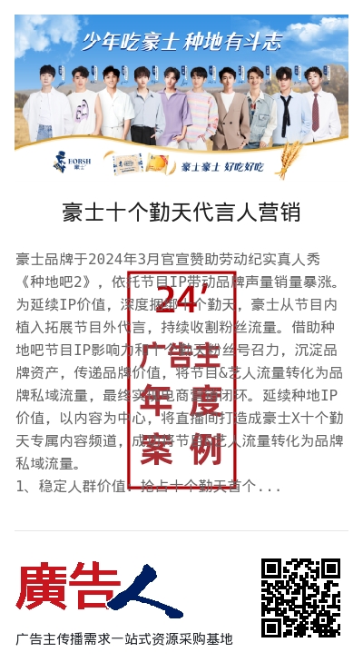 豪士品牌于2024年3月官宣赞助劳动纪实真人秀《种地吧2》,依托节目IP带动品牌声量销量暴涨。为延续IP价值,深度捆绑十个勤天,豪士从节目内植入拓展节目外代言,持续收割粉丝流量。