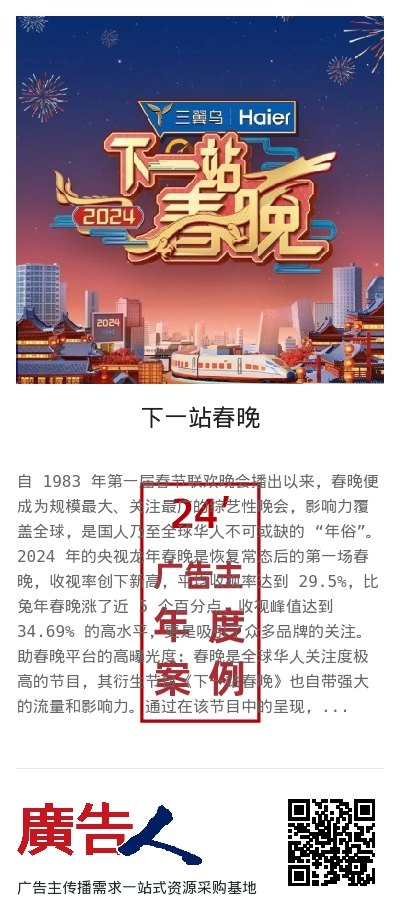 自 1983 年第一届春节联欢晚会播出以来,春晚便成为规模最大、关注最广的综艺性晚会,影响力覆盖全球,是国人乃至全球华人不可或缺的 “年俗”。2024 年的央视龙年春晚是恢复常态后的第一场春晚,收视率创下新高,平均收视率达到 29.5%,比兔年春晚涨了近 5 个百分点,收视峰值达到 34.69% 的高水平,更是吸引了众多品牌的关注。