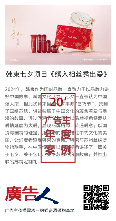 2024年,韩束作为国货品牌一直致力于以品牌力讲好中国故事,赋能文化活力;七夕一直被认为中国强人接,但此次韩束回溯七夕本源“乞巧节”,找到了国绣苏绣,讲述独属于中国文化的蕴含着爱与浪漫的故事。