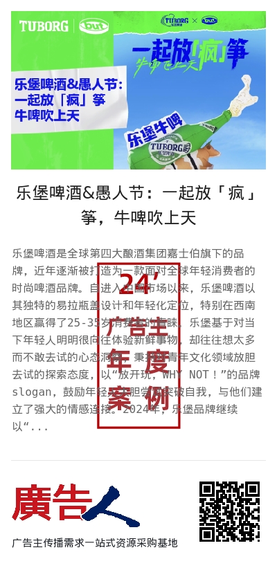 乐堡啤酒是全球第四大酿酒集团嘉士伯旗下的品牌,近年逐渐被打造为一款面对全球年轻消费者的时尚啤酒品牌。自进入中国市场以来,乐堡啤酒以其独特的易拉瓶盖设计和年轻化定位,特别在西南地区赢得了25-35岁消费者的青睐。乐堡基于对当下年轻人明明很向往体验新鲜事物,却往往想太多而不敢去试的心态洞察,秉持对青年文化领域放胆去试的探索态度,以“放开玩,WHY NOT!”的品牌slogan,鼓励年轻人大胆尝试突破自我,与他们建立了强大的情感连接。2024年,乐堡品牌继续以“放开玩,WHY NOT”的品牌态度,力将愚人节打造成专属于乐堡啤酒的节点IP!