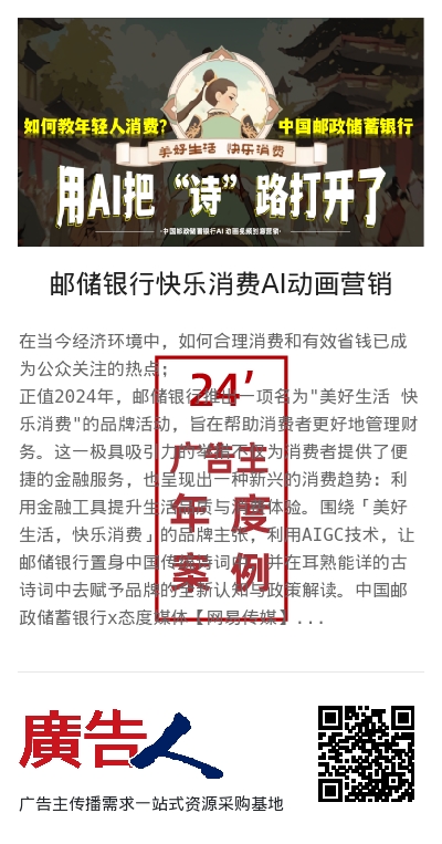 围绕「美好生活,快乐消费」的品牌主张,利用AIGC技术,让邮储银行置身中国传统诗词中,并在耳熟能详的古诗词中去赋予品牌的全新认知与政策解读。