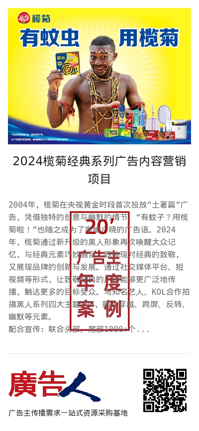 2004年,榄菊在央视黄金时段首次投放“土著篇”广告,凭借独特的创意与幽默的情节。“有蚊子?用榄菊啦!”也随之成为了家喻户晓的广告语。