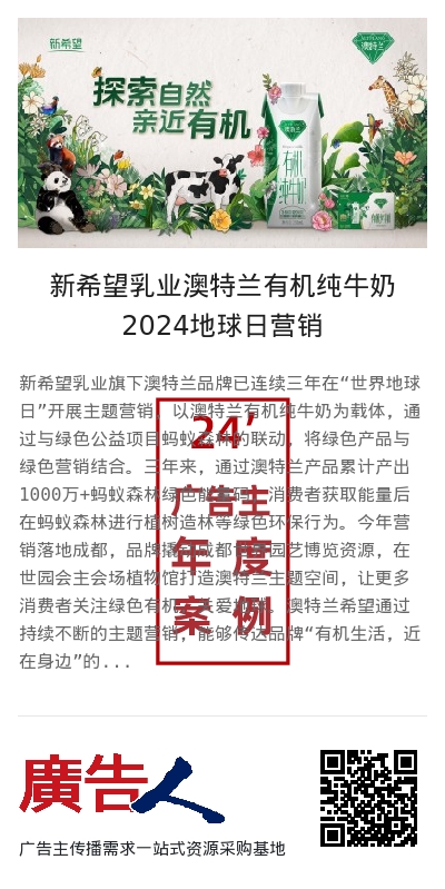 新希望乳业旗下澳特兰品牌已连续三年在“世界地球日”开展主题营销,以澳特兰有机纯牛奶为载体,通过与绿色公益项目蚂蚁森林的联动,将绿色产品与绿色营销结合。三年来,通过澳特兰产品累计产出1000万+蚂蚁森林绿色能量码,消费者获取能量后在蚂蚁森林进行植树造林等绿色环保行为。今年营销落地成都,品牌撬动成都世界园艺博览资源,在世园会主会场植物馆打造澳特兰主题空间,让更多消费者关注绿色有机,关爱地球。