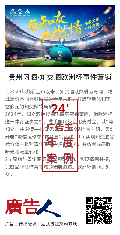 2024年,知交酒继续深化圈层营销策略,借欧洲杯这一体育盛事之机,携手国民级应用支付宝,以“与知交,共燃情——热爱无界,一杯交融”为主题,策划开展“燃情足球季”体育营销活动。