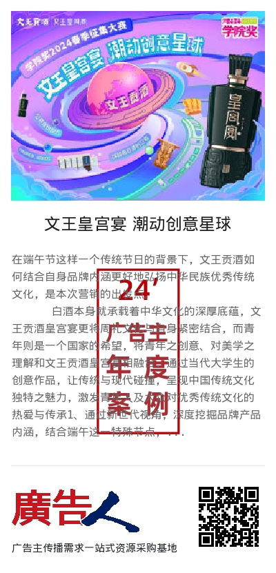1、通过新世代视角,深度挖掘品牌产品内涵,结合端午这一特殊节点,运用创新、潮流地艺术化表现形式来诠释文王贡酒的品牌文化,打造独特个性、有记忆点,识别度高的端午创意营销内容。