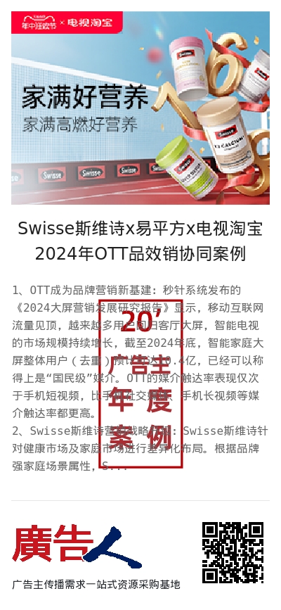 2、Swisse斯维诗营销战略升级:Swisse斯维诗针对健康市场及家庭市场进行差异化布局。根据品牌强家庭场景属性,Swisse斯维诗持续推出适合全家庭的营养健康产品。差异化布局下,不仅需要借助OTT大屏进一步扩大自身品牌影响力,更需要发挥OTT大屏在家庭营销的长处,实现品牌的塑造。