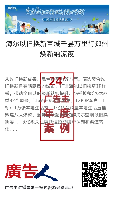 从以旧换新成果、民生购买力等方面,筛选契合以旧换新且有话题度的城市,打造海尔以旧换新IP样板,带动全国以旧换新认知提升。
