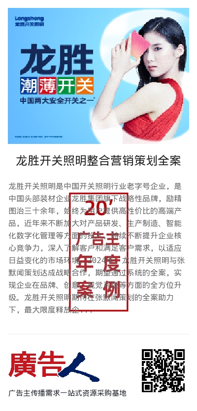 龙胜开关照明期待在张默闻策划的全案助力下,最大限度释放企业产品势能,调整企业战略,通过企业文化塑造、品牌形象打造、产品创意策划、品类创新等建设品牌护城河,在行业发展风口期抓住机遇迎接挑战,让企业在内卷严重竞争加剧的环境中转危为机。