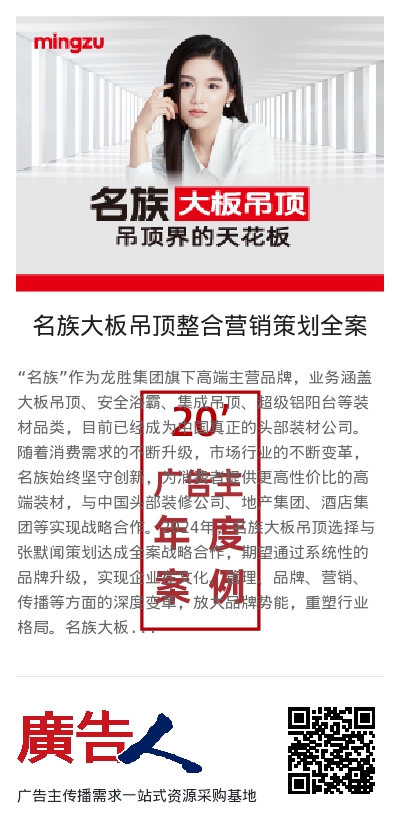“名族”作为龙胜集团旗下高端主营品牌,业务涵盖大板吊顶、安全浴霸、集成吊顶、超级铝阳台等装材品类,目前已经成为中国真正的头部装材公司。随着消费需求的不断升级,市场行业的不断变革,名族始终坚守创新,为消费者提供更高性价比的高端装材,与中国头部装修公司、地产集团、酒店集团等实现战略合作。2024年,名族大板吊顶选择与张默闻策划达成全案战略合作,期望通过系统性的品牌升级,实现企业在文化、管理、品牌、营销、传播等方面的深度变革,放大品牌势能,重塑行业格局。