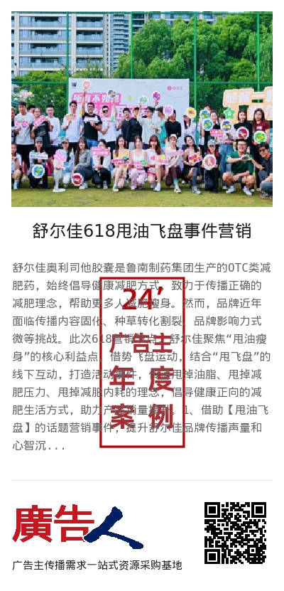 舒尔佳奥利司他胶囊是鲁南制药集团生产的OTC类减肥药,始终倡导健康减肥方式,致力于传播正确的减肥理念,帮助更多人减肥瘦身。然而,品牌近年面临传播内容固化、种草转化割裂、品牌影响力式微等挑战。此次618营销节点,舒尔佳聚焦“甩油瘦身”的核心利益点,借势飞盘运动,结合“甩飞盘”的线下互动,打造活动事件,传递甩掉油脂、甩掉减肥压力、甩掉减肥内耗的理念,倡导健康正向的减肥生活方式,助力产品销量提升。