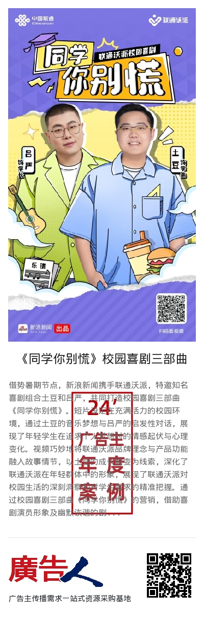 借势暑期节点,新浪新闻携手联通沃派,特邀知名喜剧组合土豆和吕严,共同打造校园喜剧三部曲《同学你别慌》。短片设定在充满活力的校园环境,通过土豆的音乐梦想与吕严的启发性对话,展现了年轻学生在追求个人梦想时的情感起伏与心理变化。视频巧妙地将联通沃派品牌理念与产品功能融入故事情节,以土豆的成长蜕变为线索,深化了联通沃派在年轻群体中的形象,展现了联通沃派对校园生活的深刻洞察和对学生需求的精准把握。