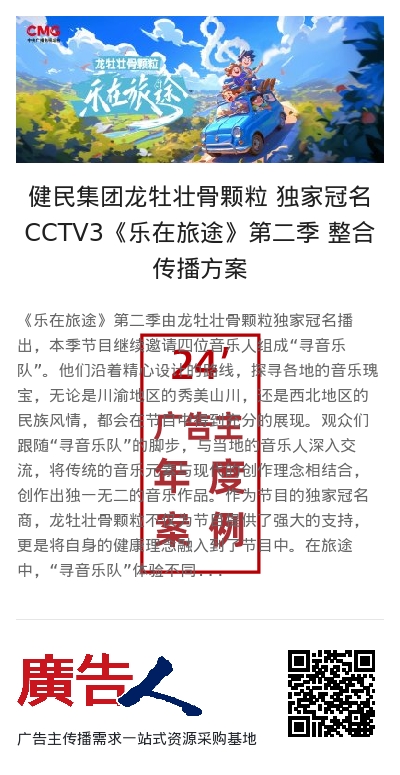 作为节目的独家冠名商,龙牡壮骨颗粒不仅为节目提供了强大的支持,更是将自身的健康理念融入到了节目中。在旅途中,“寻音乐队”体验不同的生活方式,品尝各地的美食,而龙牡壮骨颗粒则提醒大家在享受旅行的同时,也要关注身体健康。在总台的大力支持下,本次冠名不仅彰显了龙牡壮骨颗粒在中成药行业中的重要影响力,也是对健民整体品质的高度认可。借助总台高声量传播,健民集团品牌效应将持续放大。