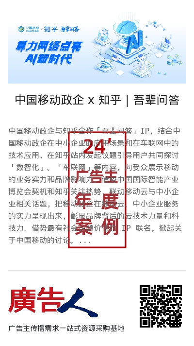 中国移动政企与知乎合作「吾辈问答」IP,结合中国移动政企在中小企业的应用场景和在车联网中的技术应用,在知乎站内发起议题引导用户共同探讨「数智化」、「车联网」等内容,向受众展示移动的业务实力和品牌影响力。