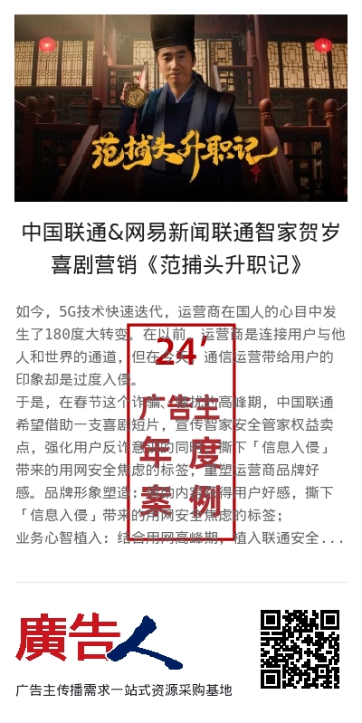 ①借助“熟人”,拉搞好感:国民捕头「范明」出演,借助“捕头”标识为联通智家守护能力代言。