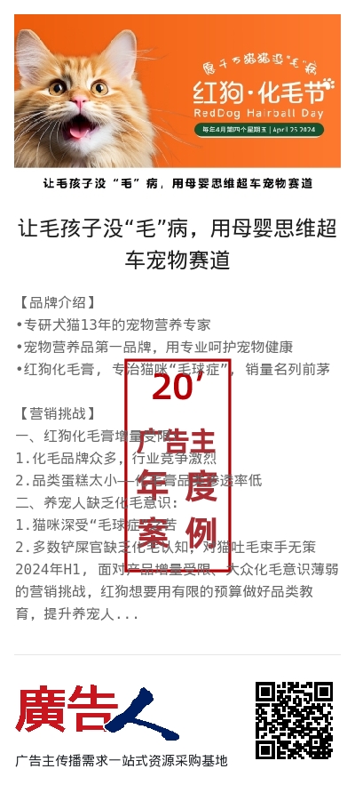 2024年H1, 面对产品增量受限、大众化毛意识薄弱的营销挑战,红狗想要用有限的预算做好品类教育,提升养宠人化毛意识,以此做大化毛膏品类蛋糕, 提高增长斜率, 巩固行业龙头地位。