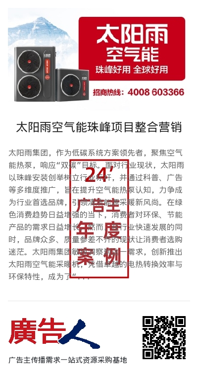 太阳雨集团,作为低碳系统方案领先者,聚焦空气能热泵,响应“双碳”目标。面对行业现状,太阳雨以珠峰安装创举树立行业标杆,并通过科普、广告等多维度推广,旨在提升空气能热泵认知,力争成为行业首选品牌,引领清洁能源采暖新风尚。在绿色消费趋势日益增强的当下,消费者对环保、节能产品的需求日益增长。然而,在行业快速发展的同时,品牌众多、质量参差不齐的现状让消费者选购迷茫。太阳雨集团敏锐洞察到这一需求,创新推出太阳雨空气能采暖机,凭借卓越的电热转换效率与环保特性,成为了“消费电气化”与“煤改电”政策下的明星产品,旨在为消费者提供可信赖、高品质的低碳生活解决方案。