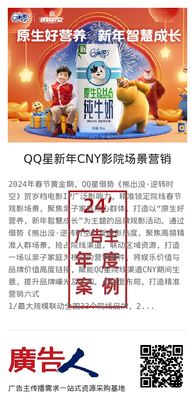 2024年春节黄金期,QQ星借势《熊出没·逆转时空》贺岁档电影IP广泛影响力,精准锁定院线春节观影场景,聚焦亲子家庭核心群体,打造以“原生好营养,新年智慧成长”为主题的品牌观影活动。