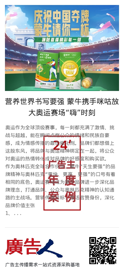 作为奥林匹克全球合作伙伴,蒙牛“天生要强”的品牌精神与奥林匹克“更快、更高、更强”的口号有着相同的底色,奥运赛场成为蒙牛品牌进一步深化品牌理念,打通品牌、公众与奥林匹克精神的认知通路的主战场。