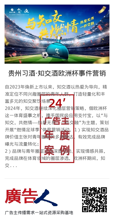 2024年,知交酒继续深化圈层营销策略,借欧洲杯这一体育盛事之机,携手国民级应用支付宝,以“与知交,共燃情——热爱无界,一杯交融”为主题,策划开展“燃情足球季”体育营销活动。
