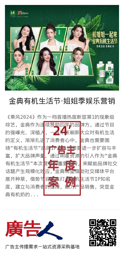 《乘风2024》作为一档首播热度断层第1的现象级综艺,金典作为连续赞助四年的品牌方,通过节目的强曝光、深植入,一直不断刷新大众对有机生活的定义,渐渐扎进了消费者心中,金典也需要围绕“有机生活节”品牌IP主张也需要进一步扩容与丰富,扩大品牌声量。