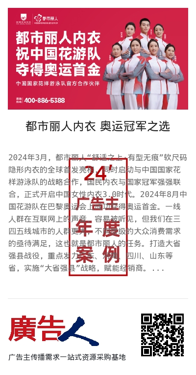 2024年3月,都市丽人“舒适之上·有型无痕”软尺码隐形内衣的全球首发亮相,同时启动与中国国家花样游泳队的战略合作,国民内衣与国家冠军强强联合,正式开启中国女性内衣3.0时代。2024年8月中国花游队在巴黎奥运会上成功夺得奥运首金。