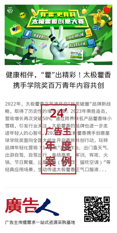 2022年,太极藿香正气液开启“品类破圈”品牌新战略,取得了历史性的增长业绩;2023年乘胜追击,营收增长再次突破50%。通过跨界联名产品藿香味小雪糕,引发行业关注,太极藿香的品牌也进一步走进年轻人的心智中。2024年,太极藿香携手创意星球学院奖面向全国大学生开启青年共创行动,玩转品牌年轻化营销?