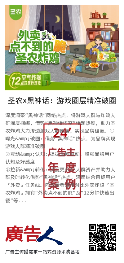 深度洞察“黑神话”网络热点,将游戏人群与炸鸡人群深度捆绑,借势“黑神话悟空”话题热度,助力圣农炸鸡大力渗透游戏人群圈层,实现品牌破圈。