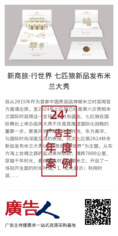 1、文化展示:利用时装秀平台,七匹狼将中国文化和东方美学融入设计之中,向世界展示中国时尚的独特魅力,增加中国文化输出、文化出海的有效实践。