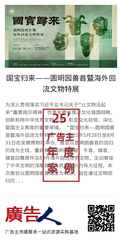 为深入贯彻落实习近平总书记关于“让文物活起来”重要指示精神,也是安徽省推进文化强国战略、创新利用中华优秀文物资源、彰显文化自信、深化爱国主义教育的重要举措。 “国宝归来——圆明园兽首暨海外回流文物特展”,于2025年5月28日至8月31日在安徽博物院举办。展览以圆明园兽首的回归历程为主线,重磅展出圆明园虎首、牛首、猴首、猪首四尊原件及83件海外回流珍贵文物,生动展现了中华文明的深厚底蕴与民族复兴的伟大征程。