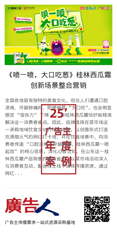 创意策略 洞察山东人的大葱饮食文化,以”喷一喷,大口吃葱“为主题,诠释桂林西瓜霜产品助力大口吃的产品特性。