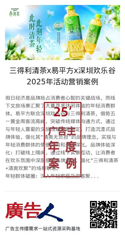 假日经济是品牌抢占消费者心智的关键战场,而线下文旅场景汇聚了大量寻求休闲体验的年轻消费群体。易平方联合深圳欢乐谷与三得利清茶,借势五一黄金周客流高峰,突破传统媒体沟通方式,通过与年轻人喜爱的文旅场景深度绑定,打造沉浸式品牌体验,强化其“清爽无负担”的品牌理念,实现与年轻消费群体的情感共鸣和关系深化。