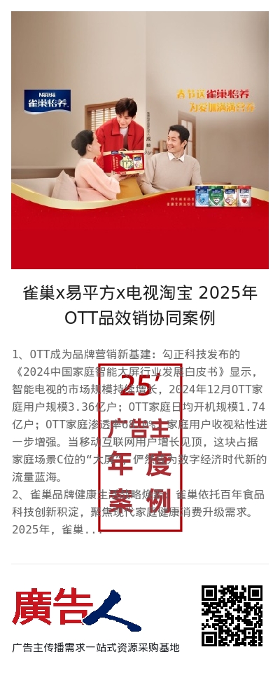2、雀巢品牌健康生活战略焕新:雀巢依托百年食品科技创新积淀,聚焦现代家庭健康消费升级需求。2025年,雀巢针对家庭市场进行布局,借助OTT大屏实现家庭场景精准触达,进一步扩大品牌影响力,发挥OTT大屏在家庭营销的优势,实现超级单品的塑造、品牌影响力的破圈。