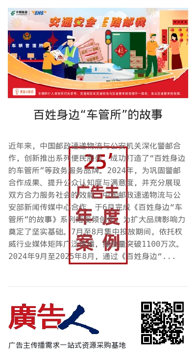 近年来,中国邮政速递物流与公安机关深化警邮合作,创新推出系列便民服务,成功打造了“百姓身边的车管所”等政务服务品牌。2024年,为巩固警邮合作成果、提升公众认知度与满意度,并充分展现双方合力服务社会的效能,中国邮政速递物流与公安部新闻传媒中心合作,于6月完成《百姓身边“车管所”的故事》系列短视频创作,为扩大品牌影响力奠定了坚实基础。7月至8月集中投放期间,依托权威行业媒体矩阵广泛传播,播放量突破1100万次。