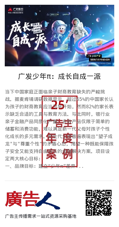 一、品牌目标:建立“少年π”差异化品牌认知,成为亲子金融领导品牌,提升品牌声量提升,打造行业标杆案例;二、用户目标:触达30万+目标家庭,转化率达10%,客户满意度超90%,建立长期用户粘性。通过创新人格派系和IP生态,实现从获客到留存的全链路优化,将广发银行打造为最懂孩子、最受家长信赖的亲子金融首选品牌。