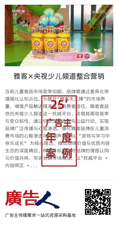 当前儿童食品市场竞争加剧,品牌需通过差异化传播强化认知占位。为提升“雅客天天棒”的市场声量,增强产品触达精准度与消费者信任,雅客食品依托央视少儿频道这一权威平台,凭借其高收视率与受众粘性,通过栏目深度合作与公益行动,实现品牌广泛传播与心智渗透。
