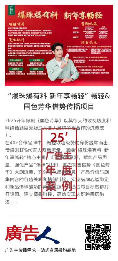 借势《国色芳华》IP价值,畅轻围绕“爆珠爆有料 新年享畅轻”核心主题,以“硬广曝光+创意内容”为投放策略,并组合微博、抖音、小红书等社交媒体矩阵,以爆款剧集赋能爆款产品。