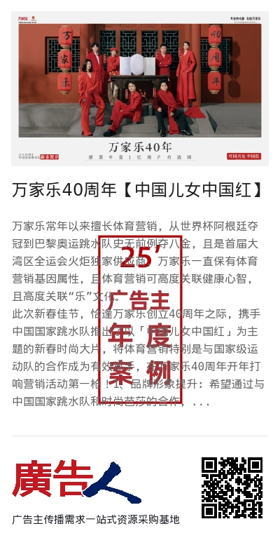 此次新春佳节,恰逢万家乐创立40周年之际,携手中国国家跳水队推出了以「中国儿女中国红」为主题的新春时尚大片,将体育营销特别是与国家级运动队的合作成为有效抓手,在万家乐40周年开年打响营销活动第一枪!