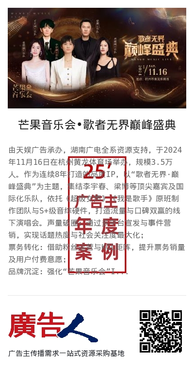 品牌沉淀:强化“芒果音乐会”IP的专业、高品质的市场认知,树立线下演唱会新标杆。