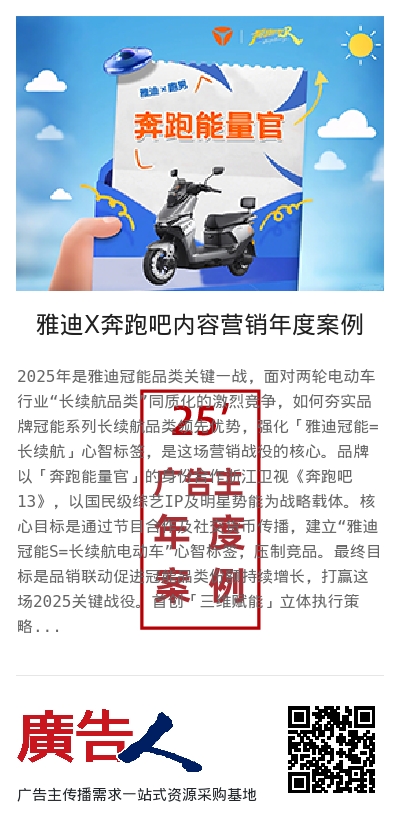 2025年是雅迪冠能品类关键一战,面对两轮电动车行业“长续航品类”同质化的激烈竞争,如何夯实品牌冠能系列长续航品类领先优势,强化「雅迪冠能=长续航」心智标签,是这场营销战役的核心。