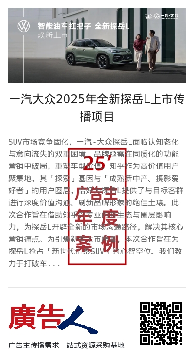 为引爆新车上市声量,本次合作旨在为探岳L抢占「新世代山系SUV」的心智空位。我们致力于打破车型固有的负面认知,通过传递「大空间」与「大智能」的焕新产品力,将功能价值升华为「探索精神」等情感价值,最终塑造独特的车型人格,与目标用户建立深度共鸣,激发其对新生活的向往,并为后续销售转化提供支持。