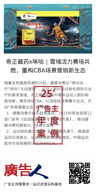 4、情感营销趋势不减:品牌竞争从功能营销转向“情感共鸣”,奇正藏药通过绑定CBA赛事IP,契合年轻群体对“活力健康”的价值追求。