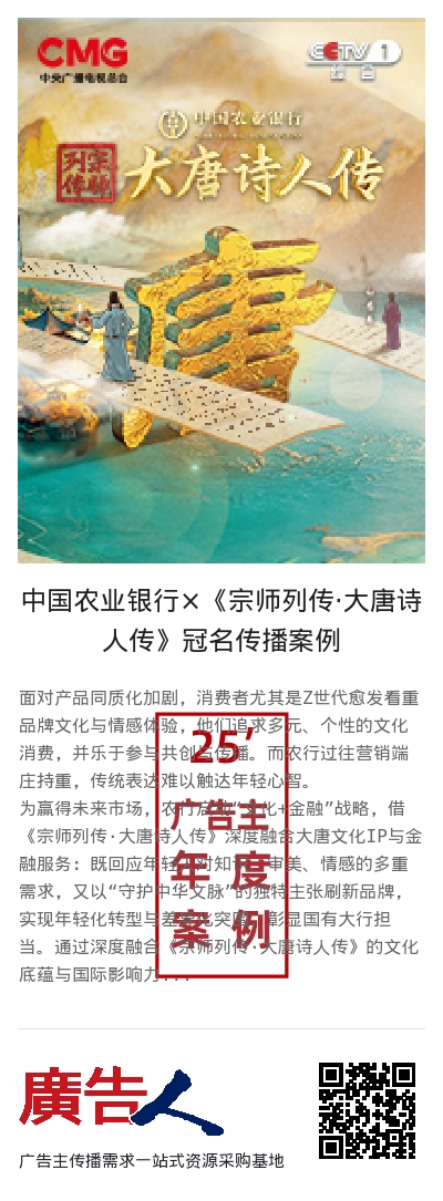 中国农业银行以“唐诗里的中国梦”为IP营销主题,联合央视顶级文化节目《宗师列传·大唐诗人传》,深耕大唐“顶流诗人”与千古名篇,借中华优秀传统文化回归契机,实现Z世代喜闻乐见的大唐文化IP与农行品牌的深度融合,让年轻用户理解农行品牌使命,助力品牌形象焕新。