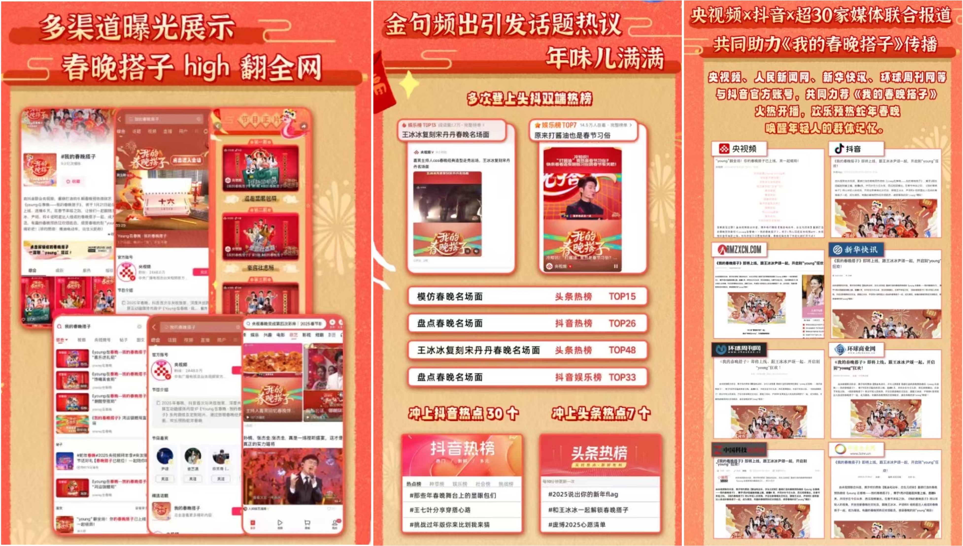 紧贴春晚焕新升级,双平台联动强势出圈,央视频首次跨平台,和抖音联合打造面向2025年总台春晚的跨屏互动社交新媒体节目。以“用青春之young,秀春晚之美,展春节之蕴”为主题,紧紧围绕年轻人的喜好,主打“年轻化”春晚节目。包含《我的春晚搭子》六期微综和《young在春晚》直播,前者为王冰冰、尹颂携搭子团围绕春晚经典与年轻人感兴趣的话题展开讨论,后者为春晚前倒计时6小时大直播。
