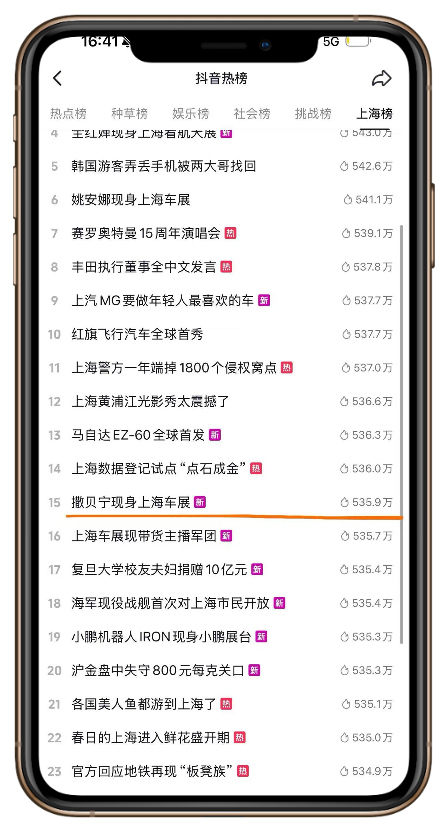 “撒贝宁打卡上海车展”话题成热点,荣登微博文娱榜TOP18、抖音上海热榜TOP15,话题总阅读量超1.2亿;
