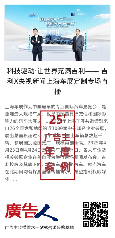 2025年4月23日至4月24日是上海车展媒体日,各大车企及相关参展企业在各自展台举行百场新闻发布会,吉利控股及其旗下的吉利汽车、极氪汽车、领克汽车在此期间均有探展营销传播需求,希望搭载权威媒体进行新车的发布、颠覆性创新技术的解读,借此提升品牌的曝光度。