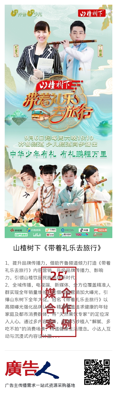 1、提升品牌传播力,借助齐鲁频道倾力打造《带着礼乐去旅行》内容营销,升级品牌传播力、影响力,引领山楂饮品民族品牌新时代。