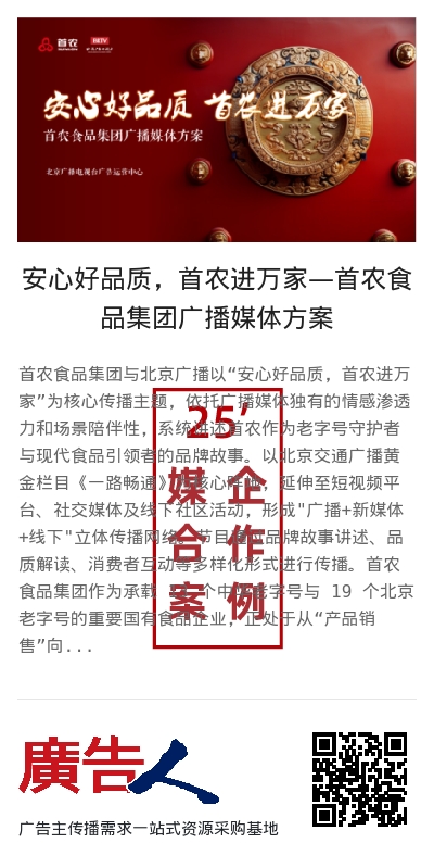 首农食品集团作为承载 13 个中华老字号与 19 个北京老字号的重要国有食品企业,正处于从“产品销售”向“品牌塑造”战略转型的关键阶段,亟需提升品牌现代形象与文化引领力。而北京广播作为首都权威媒体平台,拥有广泛受众覆盖和深厚文化传播底蕴,双方基于“弘扬国潮、守护京味”的共同使命达成合作。该项目致力于提升品牌声量,更强调文化价值与消费者信任的双向传递,助力首农实现从“产品供应商”到“生活方式倡导者”的战略升级。